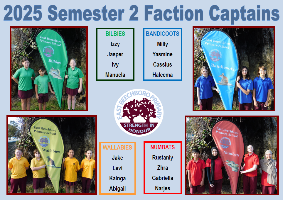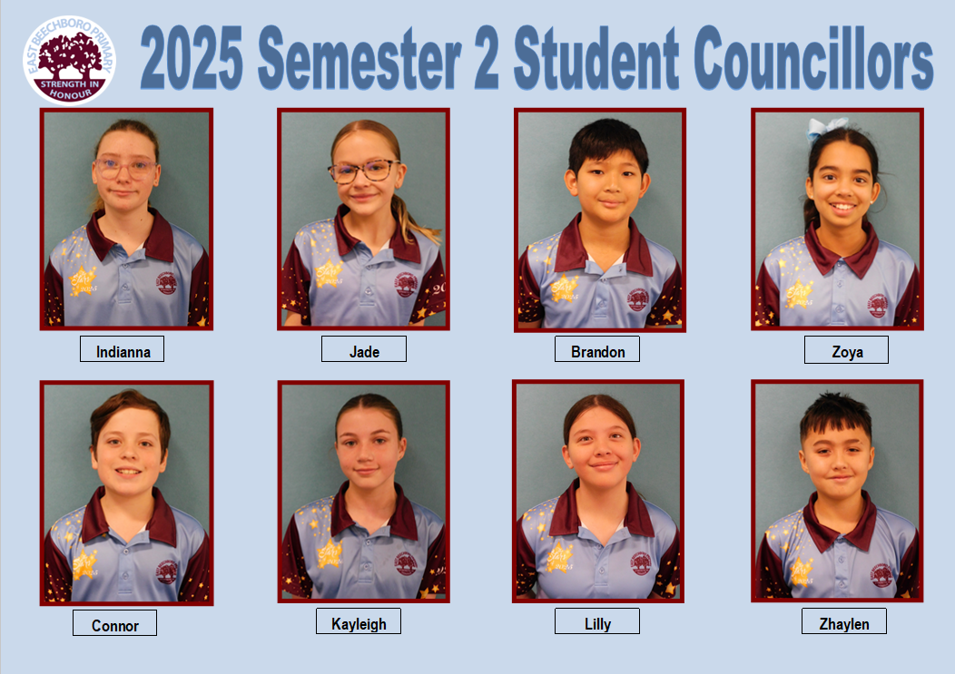 The East Beechboro Student Council is comprised of six to eight Year 6 students who are elected each semester. They provide supportive role modelling to all students whilst gaining important leadership, social and communication skills.